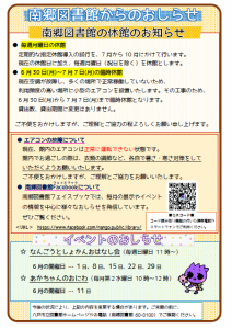 今回ご紹介するのは南郷図書館の令和7年6月に開催する本の展示のお知らせです。