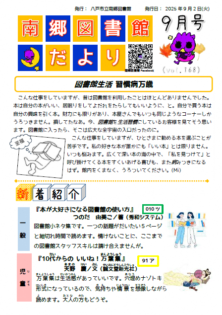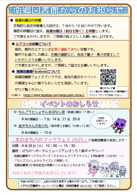 今回ご紹介するのは南郷図書館の令和7年9月に開催する本の展示とイベントのお知らせです。