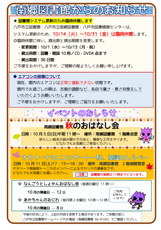 10月の休館日は、6日(月)、14日(火)~31(金)です。